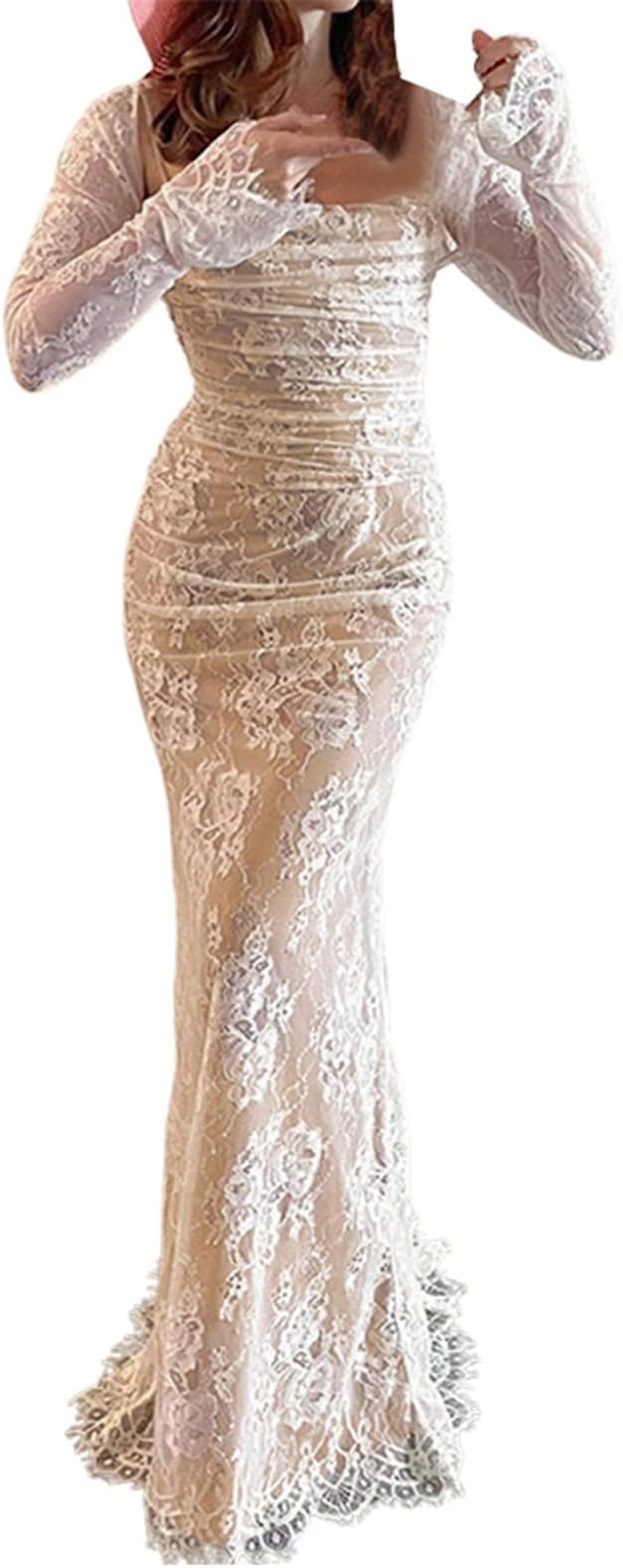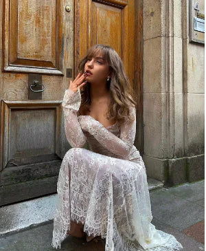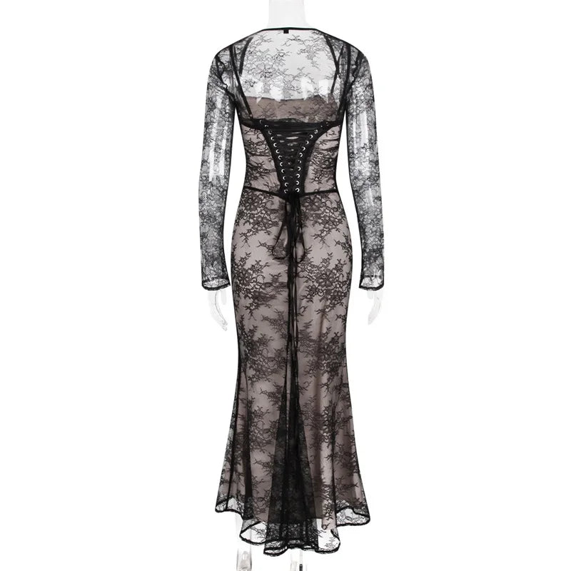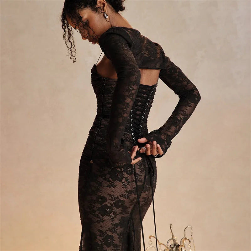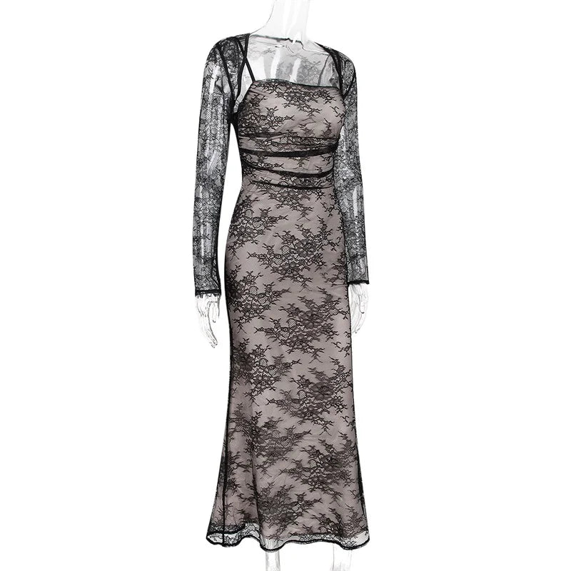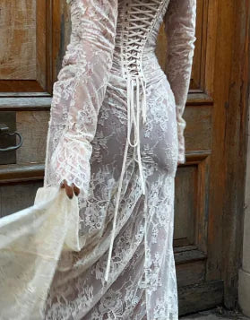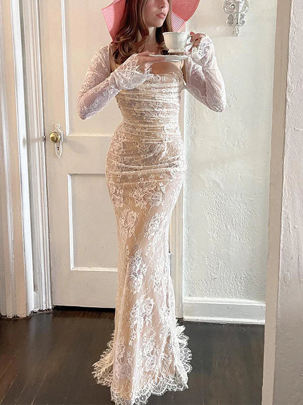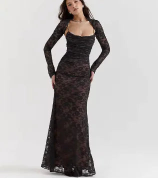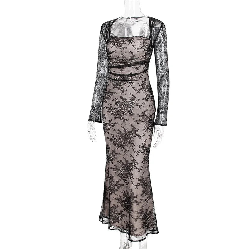 فستان ماكسي أنيق عتيق من الدانتيل بأكمام طويلة