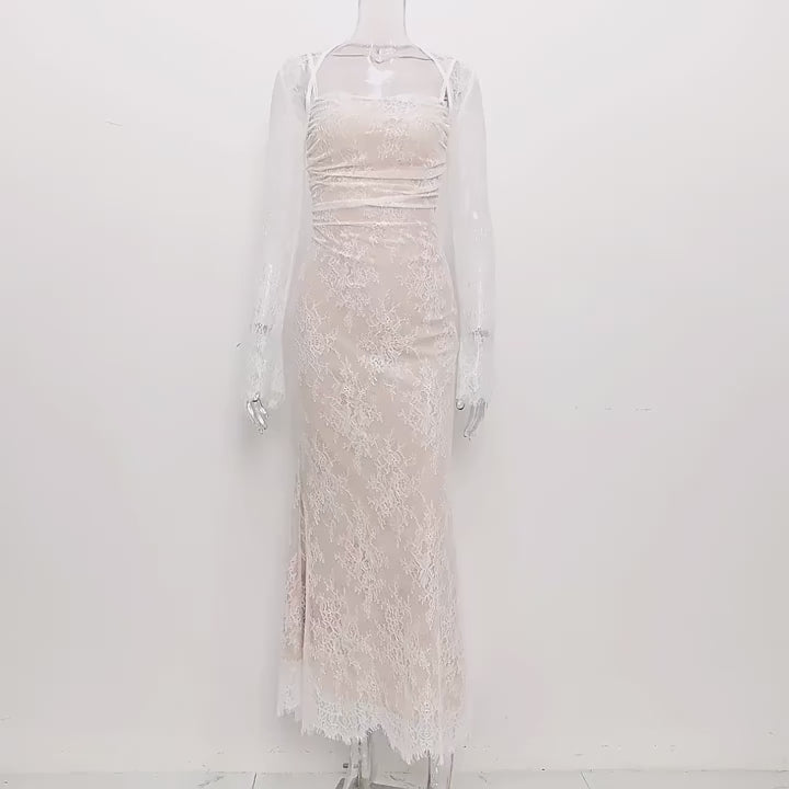 احصلي على انطباع دائم مع هذا الفستان الطويل الأنيق المصنوع من الدانتيل مع عباءة بأكمام طويلة - وهو إضافة لا غنى عنها لأي خزانة ملابس في المناسبات الخاصة التي تريدين فيها التألق.