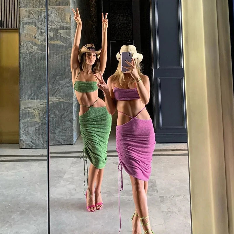Embrace summer with confidence in Sexy Outfits for Woman 2 Piece Sets designed to showcase your curves. The drawstring skirts and crop tops highlight your figure, making you feel chic and ready for beachside fun or tropical getaways.