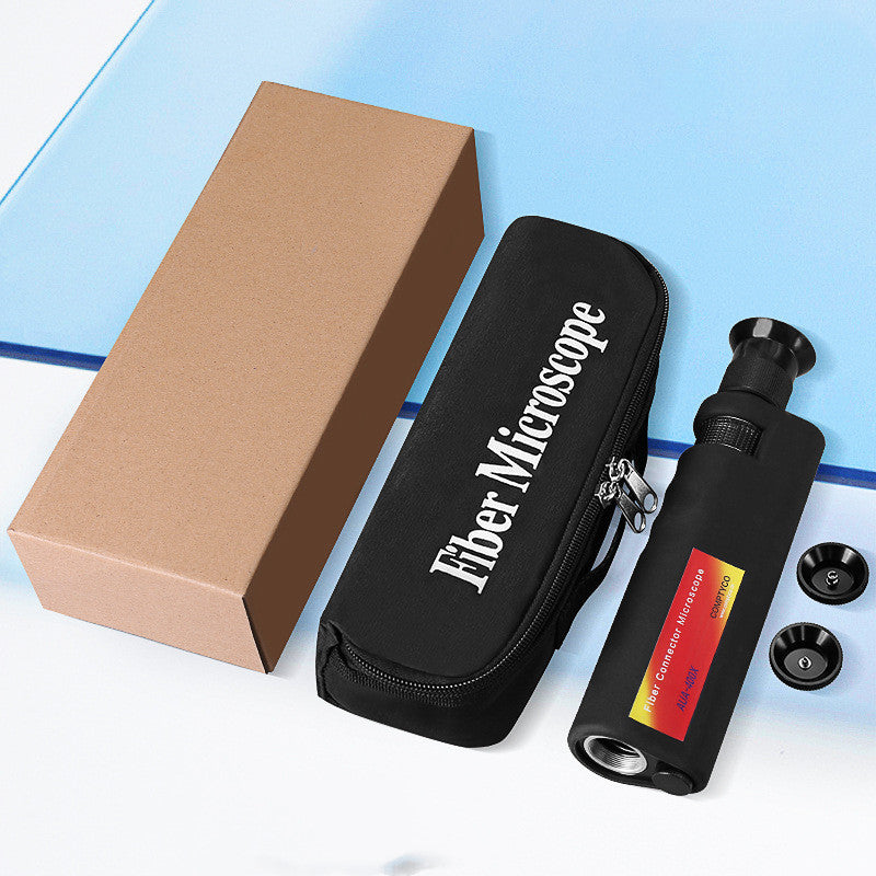 The 400x Handheld Fiber Optic Magnifier Microscope is a powerful and portable tool designed for precision inspection of fiber optic end faces. With 400x magnification and a built-in LED light (1W hour lifespan), this magnifier ensures clear, detailed views for accurate diagnostics. It features a built-in infrared attenuation filter and comes with dual adapter interfaces (1.25mm for LC and 2.5mm for SC, FC, ST interfaces), making it versatile for various fiber optic applications. Powered by 3 AAA 1.5V dry batteries, this handheld magnifier is lightweight, easy to use, and perfect for on-the-go professionals. The set includes a magnifying glass, adapters, a convenient carrying bag, a user manual, and a protective box for storage.